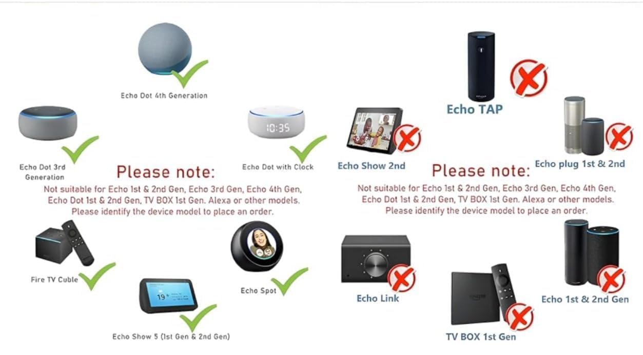 [Not Compatible:] WILL NOT BE FOR 1st Gen TV Box, Fire TV Stick, Echo Tap, Echo Dot 1st and 2nd Gen Echo Show 2nd Gen and Echo Plus 2nd Gen