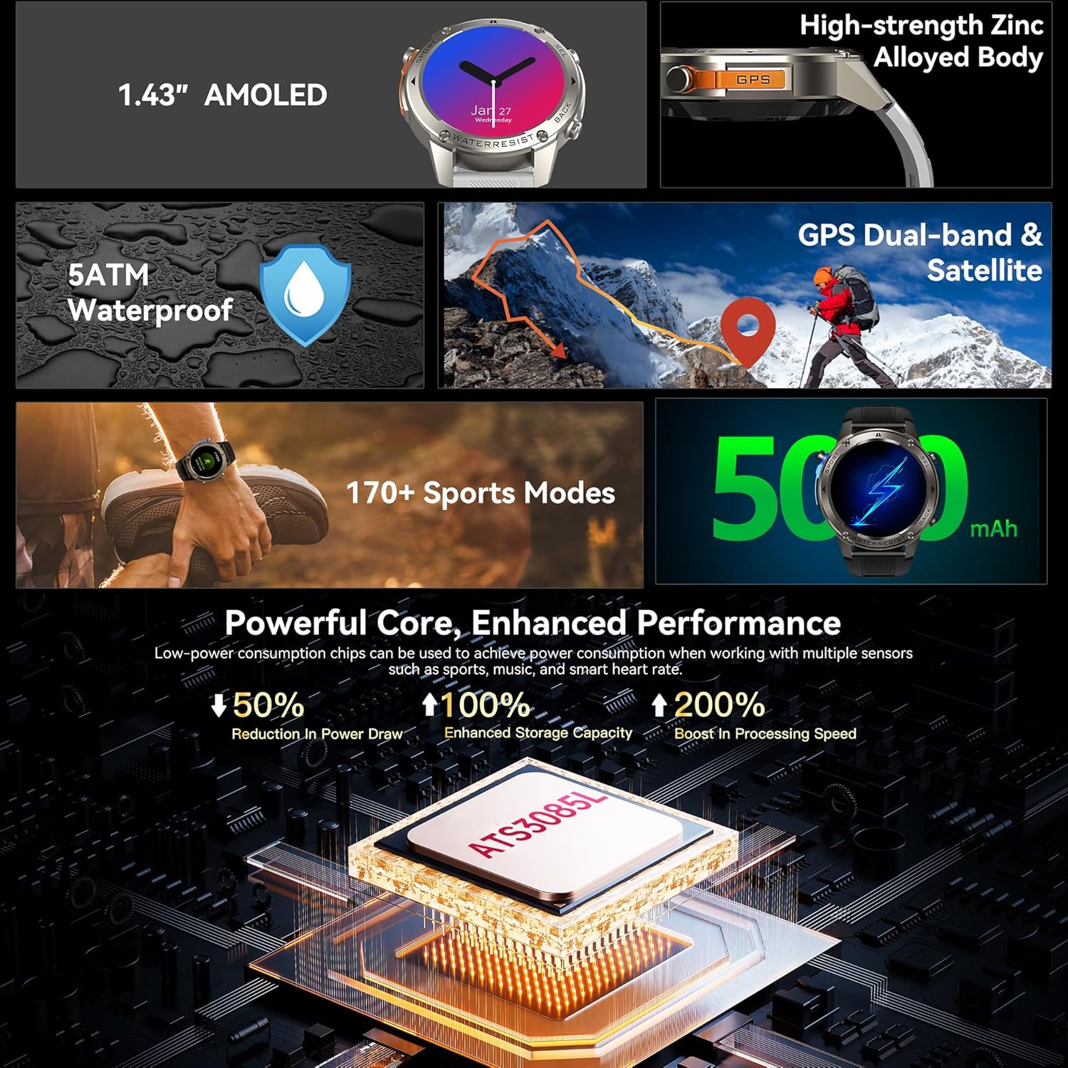 2025 GPS Smartwatches, 1.43” AMOLED Always-On Display, 50M Swimming Waterproof, 170+ Sports Mode, 500mAh Battery, Make&Answer Call Smart Watches for Man, Fitness Watches for iOS and Android (Black)