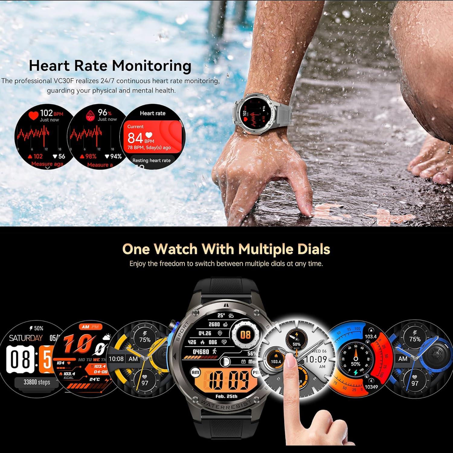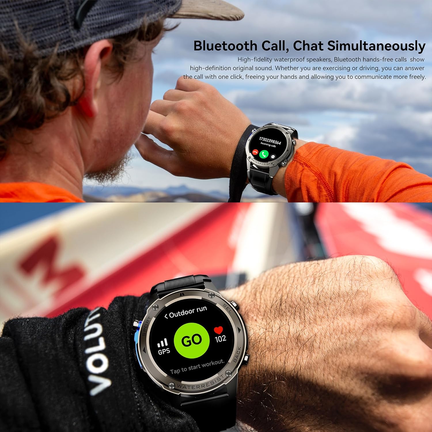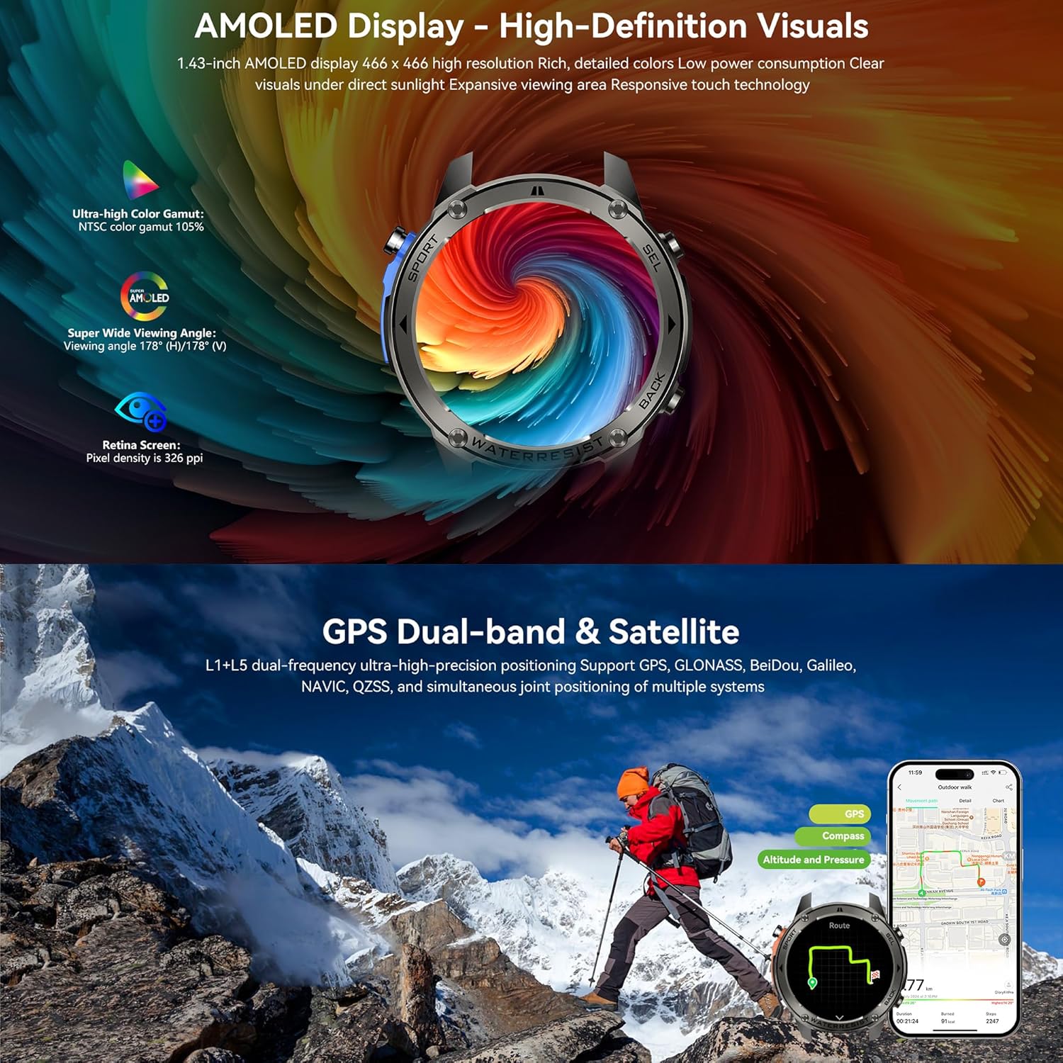 ➤【Military Grade Quality & AMOLED Screen】Experience rugged durability with cutting-edge technology in our Military Grade Smart Watch. Built to withstand the toughest conditions, it features a metal body, dustproof and drop-resistant design, with a zinc alloy front housing and a steel-reinforced back cover. 1.43” AMOLED full-touch screen delivers vibrant visuals with 466x466 resolution, and support always-on display screen. With 6 sleek theme styles, including honeycomb, turbulence, list, halo, dial, waterfall, this watch offers both form and function for everyday wear and adventure. ➤【Built-in GPS & Altitude Barometer Compass】Designed for adventurers who demand precision and reliability. Equipped with L1+L5 dual-frequency technology, this GPS Sport Watch offers high-precision positioning by seamlessly connecting to multiple satellite systems, including GPS, BeiDou, GLONASS, Galileo, NAVIC, QZSS, and AGPS. Whether you are running in the city, or hiking in the wild forest, this smartwatch can accurately track your location information. It also includes an internal compass, barometer, and altitude sensor that displays your current location altitude and barometric pressure. Durable, accurate, and packed with features—this smart watch is your ultimate outdoor companion. ➤【5ATM IP69K Waterproof & Professional Swimming Mode】This waterproof smart watch adopts a fully enclosed metal body, which can be easily immersed into 50m deep water, and can easily achieve 5ATM dynamic waterproof and IP69K static waterproof. Its waterproof speaker and microphone ensure no matter swimming, diving, or surfing can wear it with peace of mind. And this watch built-in unique professional SWOLF swimming mode, with informative data recording and professional data analysis ability, tracks your performance, helping you stay on top of your goals. ➤【Ultra Long Life Battery】A robust 500mAh battery keeps you connected for longer. Enjoy up to 24 hours of continuous GPS tracking, 4 days with the always-on display, or 5-10 days with regular use. In standby mode, this powerhouse can last up to an impressive 65 days, ensuring you're always ready for your next adventure. ➤【Bluetooth Call & Message Notification】This smart watch for men women helps you stay connected effortlessly with Bluetooth Call and Message Notifications, powered by the latest Bluetooth 5.3 technology. Receive calls, texts, and notifications directly on your smartwatch, keeping you in touch without needing to reach for your phone. Seamless, reliable, and always up-to-date—communication has never been easier. ➤【5 Sport Automatic Recognition & Multi Sport Modes】Exclusive smart recognition mode, include walking, running, cycling, elliptical machine, rowing machine, no need to manually, when you exercise automatically recognise your sport and turn on the exercise monitoring screen. With 170+ sports modes, including 14 built-in modes like outdoor running, cycling, swimming, and triathlons, this watch is your ultimate fitness companion. Customize your experience with 10 sports categories, covering everything from winter sports and extreme activities to dance and ball games. Dynamic and versatile, it adapts to all your fitness needs, whether you're pushing your limits or maintaining an active routine. ➤【Live Recognition Heart Rate Monitor and Sleep Tracker】This fitness tracker smartwatch is equipped with VC30F low-power high-precision heart rate & blood oxygen detection chip, which supports live recognition for more accurate detection. Unlock your fitness potential with a multifunctional smart watch that monitors your heart rate and blood oxygen levels 24 hours. It comes with health tracking features that can monitor sleep patterns, stress levels, and menstrual cycles for women. Stay on top of your daily activity with movement tracking, step counting, distance measurement, and calorie tracking. The watch offers guided breathing exercises and sedentary reminders for a balanced lifestyle. ➤【Other Functions & Wide Compatibility】Discover a world of convenience with a wide array of features on the Smart Watch, designed for seamless connectivity through the GloryFitPro app, compatible with Android 5.0+ and iOS 11+. Control your music, access the AI Voice Assistant, and stay updated with the weather forecast—all from your wrist. Additional features include remote camera control, phone finder, compass, barometer, altimeter, and an always-on display with adjustable brightness. Stay organized with tools like a world clock, stopwatch, alarm, timer, calculator, and flashlight. Personalize your watch with customizable watch faces, themes, and password protection.