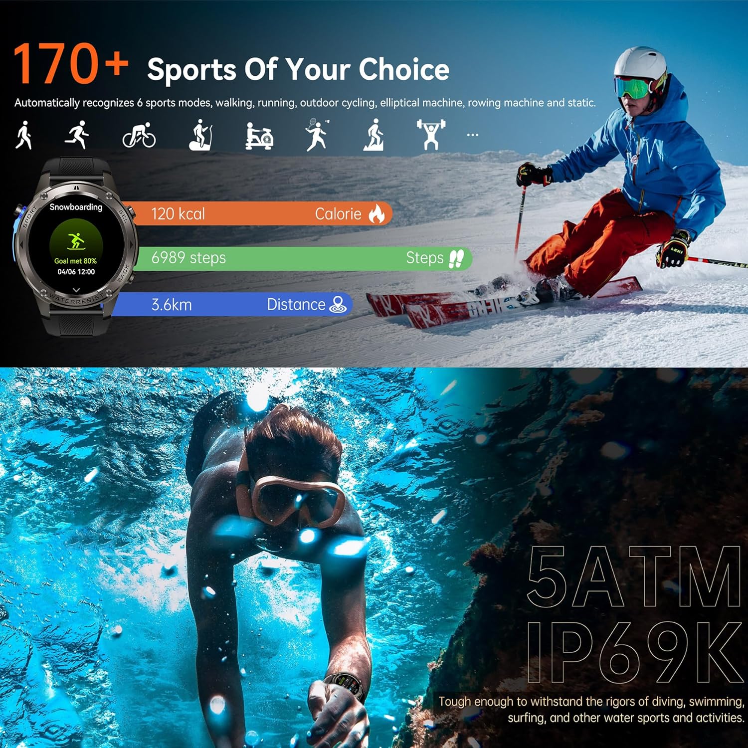 ➤【5ATM IP69K Waterproof & Professional Swimming Mode】This waterproof smart watch adopts a fully enclosed metal body, which can be easily immersed into 50m deep water, and can easily achieve 5ATM dynamic waterproof and IP69K static waterproof. Its waterproof speaker and microphone ensure no matter swimming, diving, or surfing can wear it with peace of mind. And this watch built-in unique professional SWOLF swimming mode, with informative data recording and professional data analysis ability, tracks your performance, helping you stay on top of your goals.