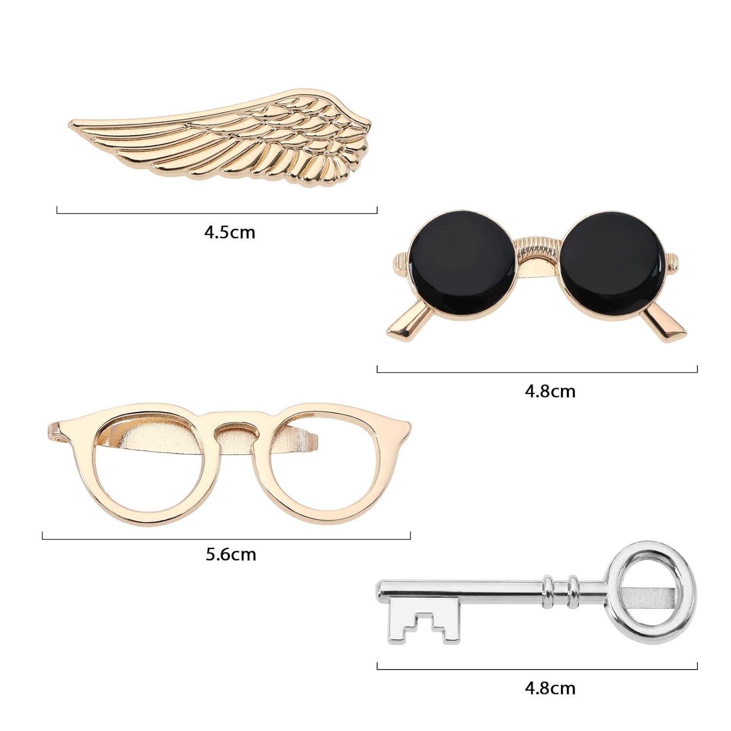4PCS Tie Clips Necktie Bar Pinch Clasps 4 Patterns Wing & Key & Sunglasses & Eyeglasses Men Tie Accessories for Men Boys Father Husband Lover, Multisize