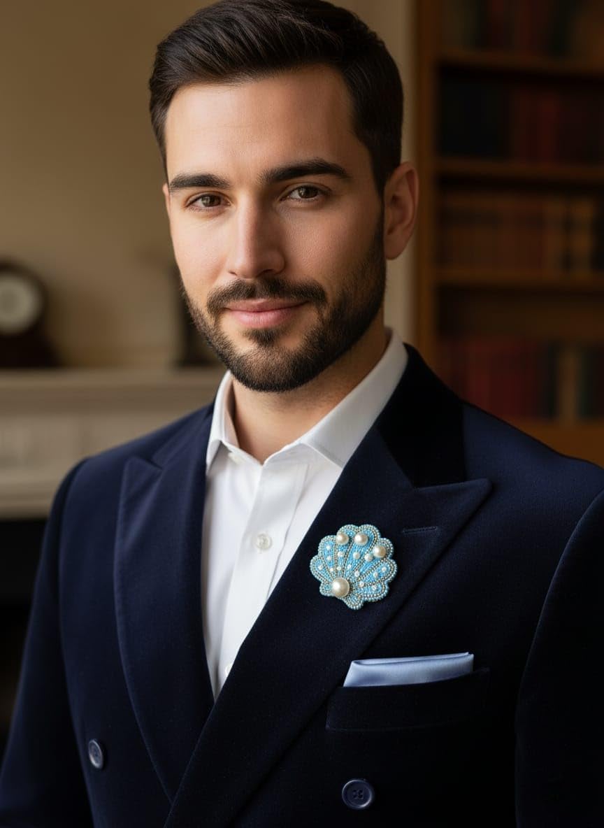 Discover the exquisite craftsmanship of this stunning oyster-inspired brooch, meticulously handcrafted using traditional Mughal embroidery techniques that date back to the 12th century. The brooch features an elegant arrangement of turquoise blue glass beads, lustrous pearls, and sparkling crystal accents, creating a sophisticated sea-inspired design. Measuring approximately 5-6 centimetres, this versatile accessory weighs just 10 grams and adds a touch of timeless elegance to any outfit. The intricate beadwork showcases traditional artisanal skills with precise detailing and dimensional texture. Perfect for adorning sarees, dresses, tops, jackets, or even backpacks, this unisex brooch seamlessly blends centuries-old craftsmanship with contemporary style. Each piece is carefully handcrafted in India using premium glass beads and features secure fastening. The harmonious combination of turquoise, pearl white, and golden tones makes this brooch a striking statement piece that elevates both traditional and modern ensembles. Its delicate yet durable construction ensures this beautiful accessory will be treasured for years to come.