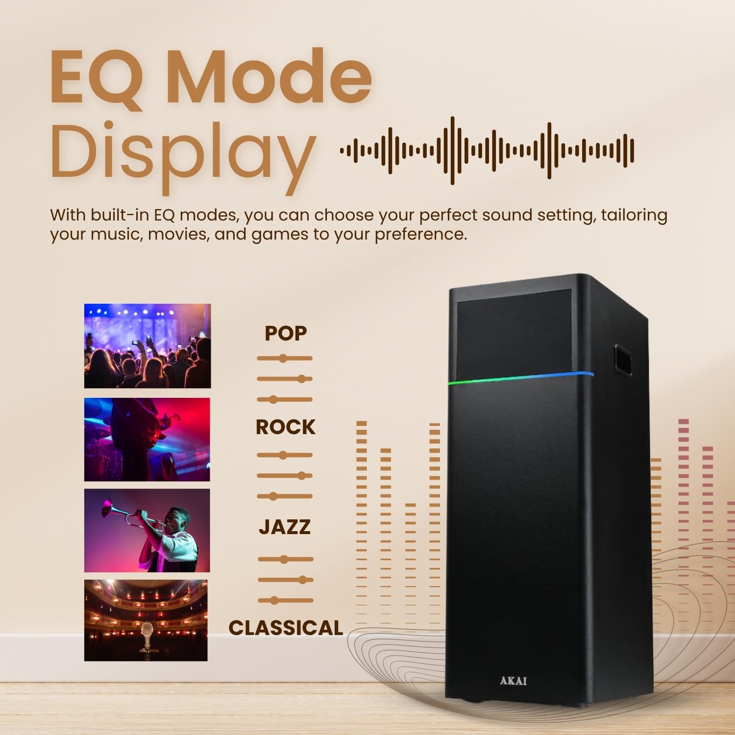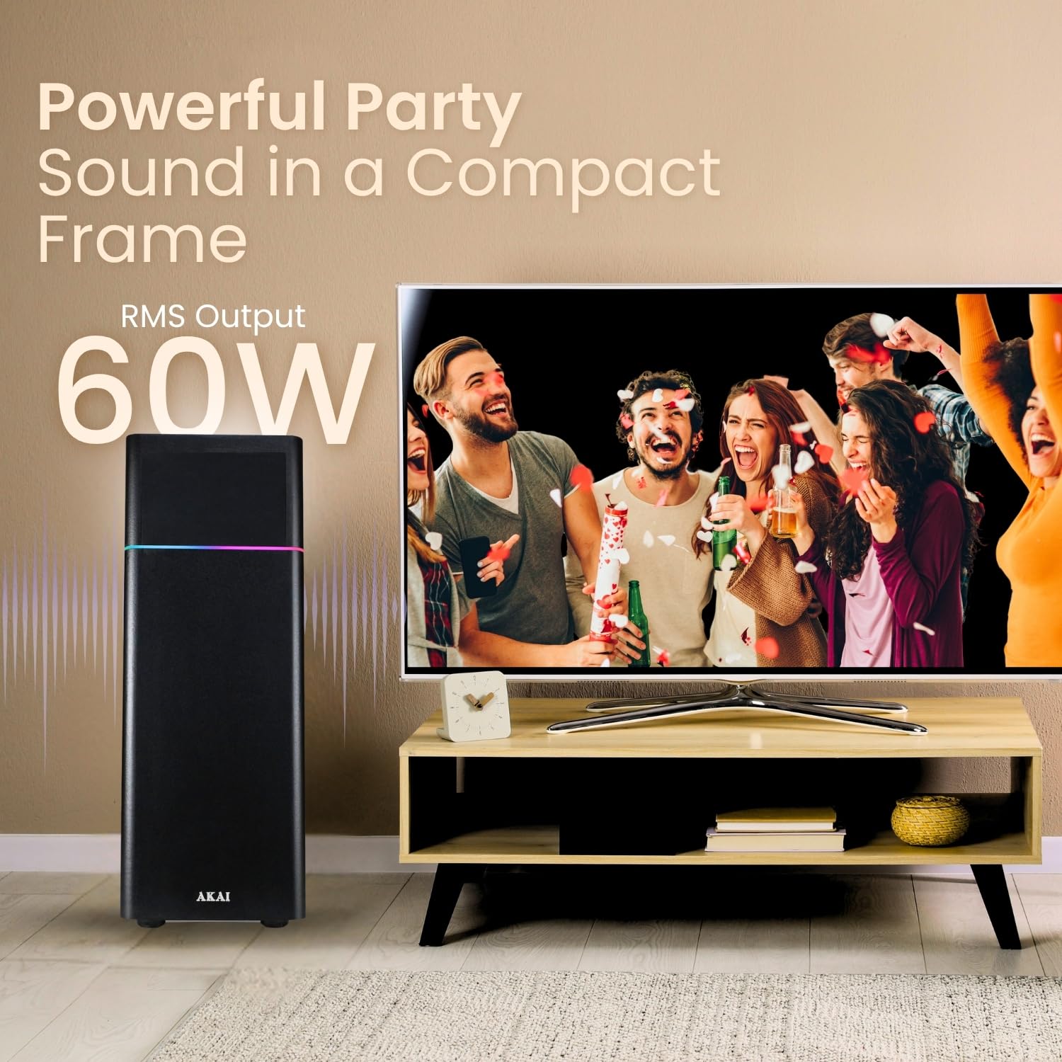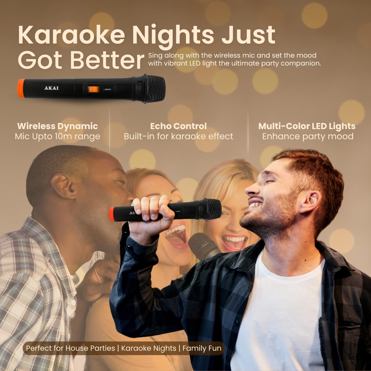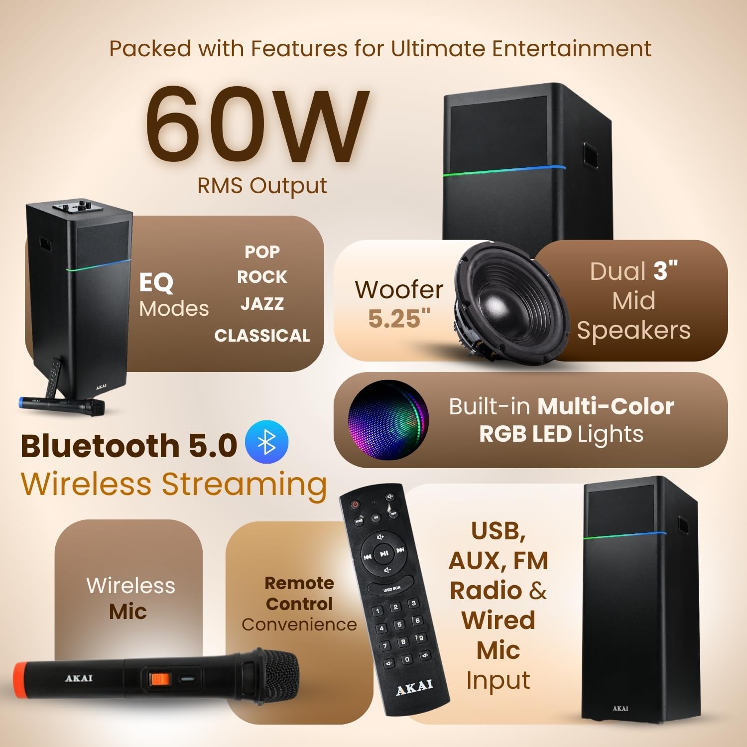 AKAI Bluetooth Speaker 60W RMS With Remote - 1 Year Warranty | Dual 3" Mid Speaker 5.25" Woofer |Home Theater, Karaoke mic, LED Light, High Bass, EQ Modes | Supports TV, PC & Smartphone (UltraBoom-60)