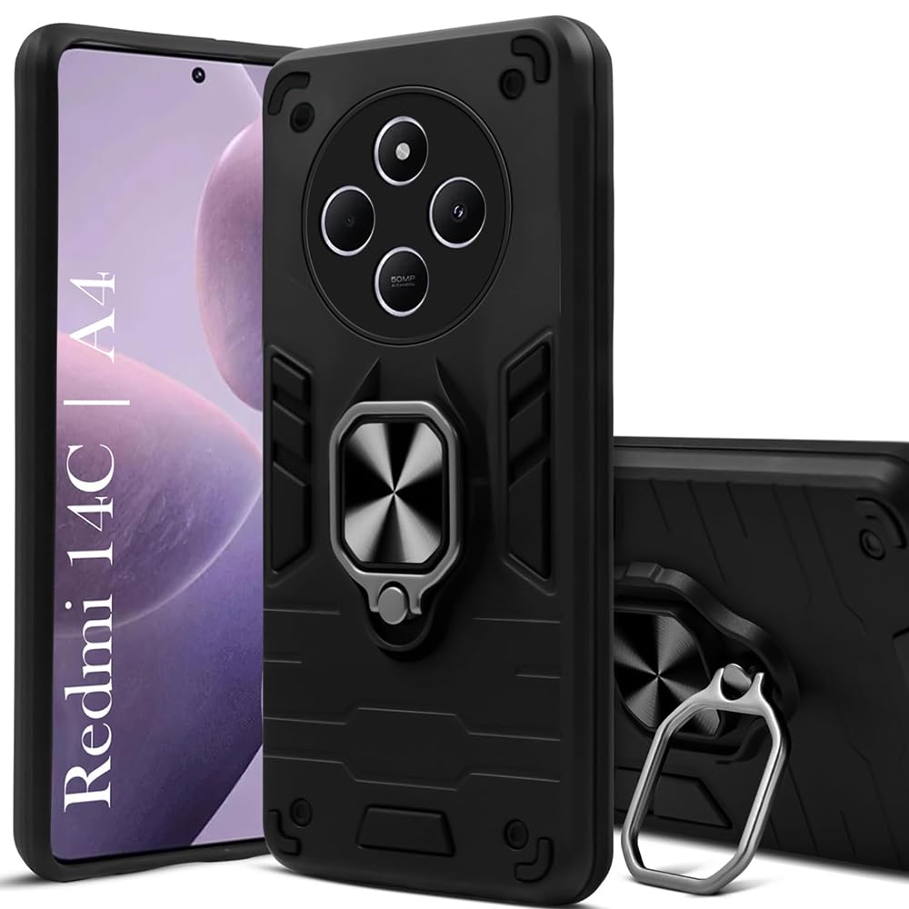Amazon Brand-Solimo Kickstand Mobile Back Cover (360° Rotating Ring Holder) for Mi Redmi A4 5G / 14C 5G / 14R 5G / Poco C75 5G / M7 5G (Black)