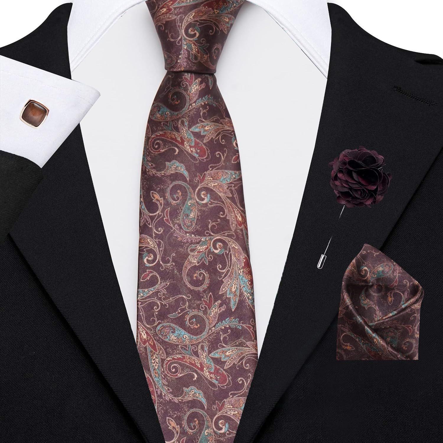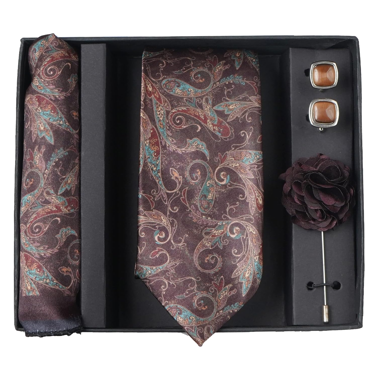 Axlon Tie for Men – Self Silk Neck Ties Set with Cufflinks Flower Pin, Pocket Square & Black Gift Box, Combo Necktie Sets for Office Wear, Formal Suits & Weddings (Brown, 2022AX_19)
