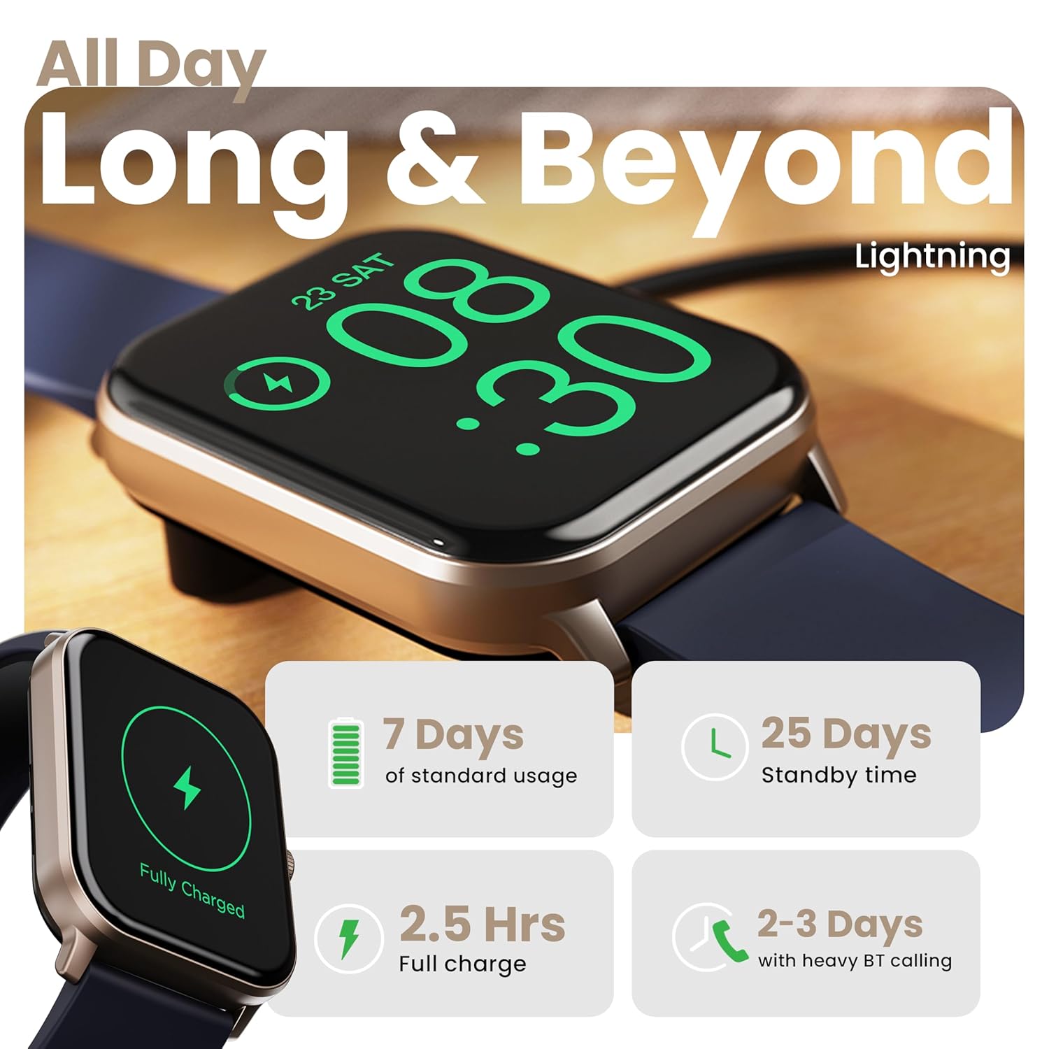 Long Battery Life: Get up to 2-3 days of battery life with heavy Bluetooth calling use, and up to 7 days in regular mode. Standby mode lasts an impressive 25 days, with a quick charge time of 2.5 hours, ensuring your smartwatch is ready when you are.