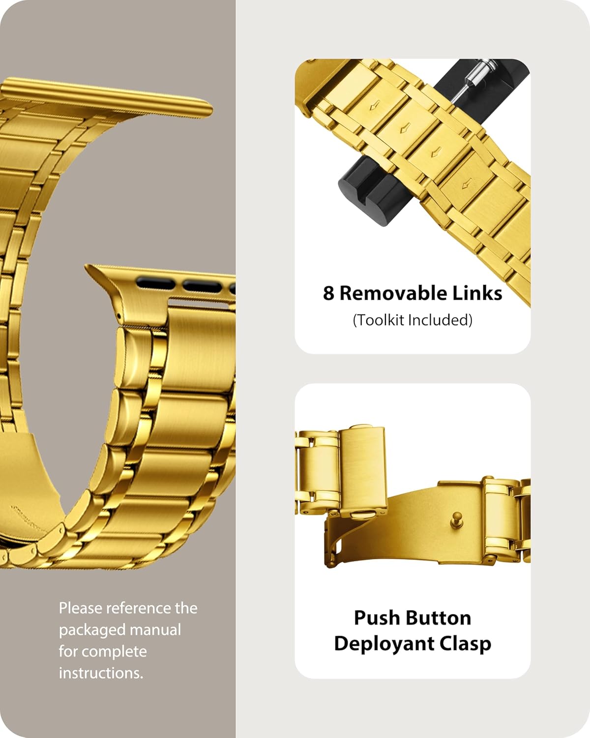 [Easy Adjustment]: Our Apple Watch correa 41mm 40mm 38mm comes with eight removable links, with four on each side. The enclosed link removal tool makes size adjustments a breeze. Follow the steps in the instruction manual or video clip to adjust the iWatch band and get the perfect fit on your wrist.