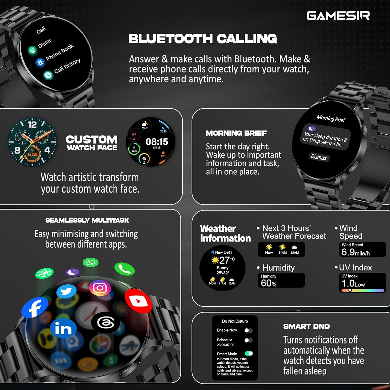 GameSir Active 5 Smart Watch AMOLED Display 1.3" Screen, 360 * 360 Resolution, IP68 Waterproof with Multiple Watch Faces Bluetooth Calling Round Dial Smartwatch for Men & Women (Metal-Black)