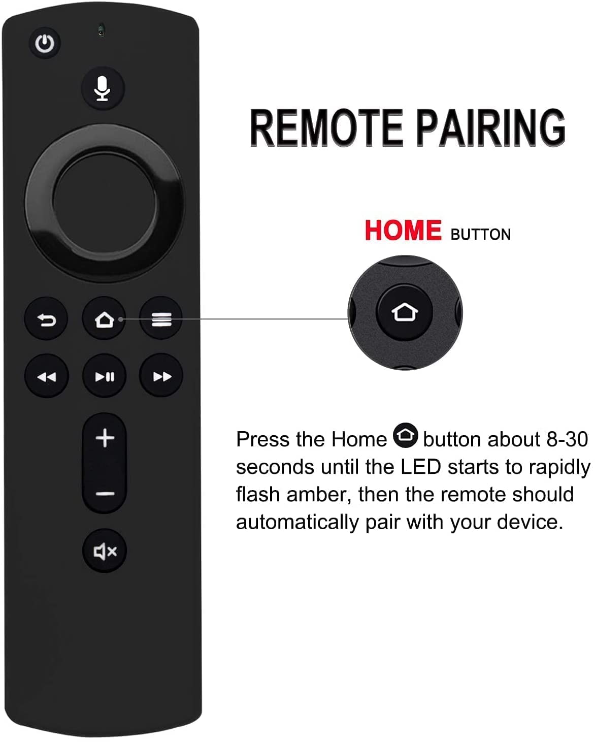 [ Pairing Required] This is voice remote control, you need to pair it first before you use, and below is pairing steps: Press the Home button about 8-30 seconds until the LED starts to rapidly flash amber, then the remote should automatically pair with your device.