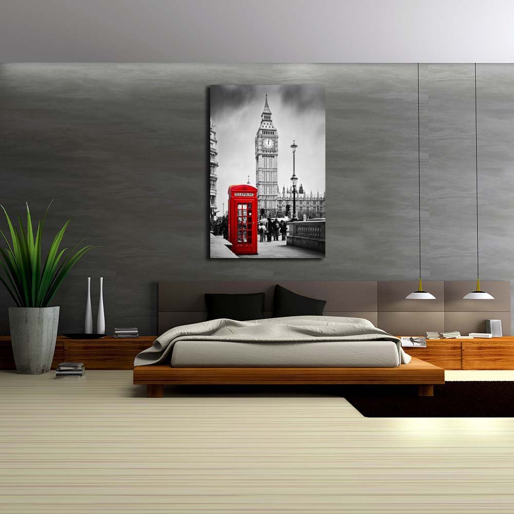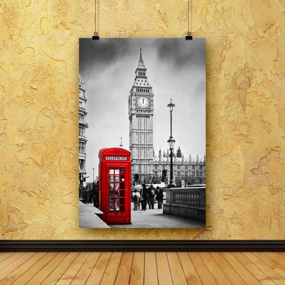 Pitaara Box Red Telephone Booth & Big Ben In London, UK D1 | Canvas Painting for Bedroom & Living Room | Engineered Wood Frame | 16 x 24 inch (41 x 61 cms)