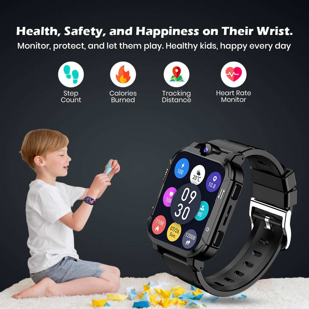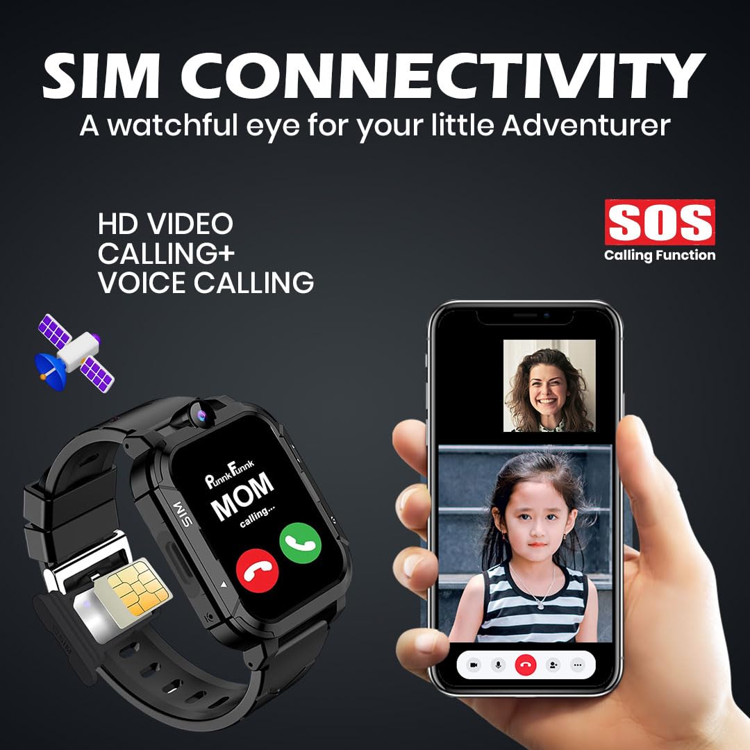 PunnkFunnk Safeguard Kids Smart Watch 5G/4G with SIM Calling, GPS Tracker, Video Calling, SOS Alerts, Face Unlock, Voice Chat, Games, IP67 Waterproof, 800mAh Battery (Black)