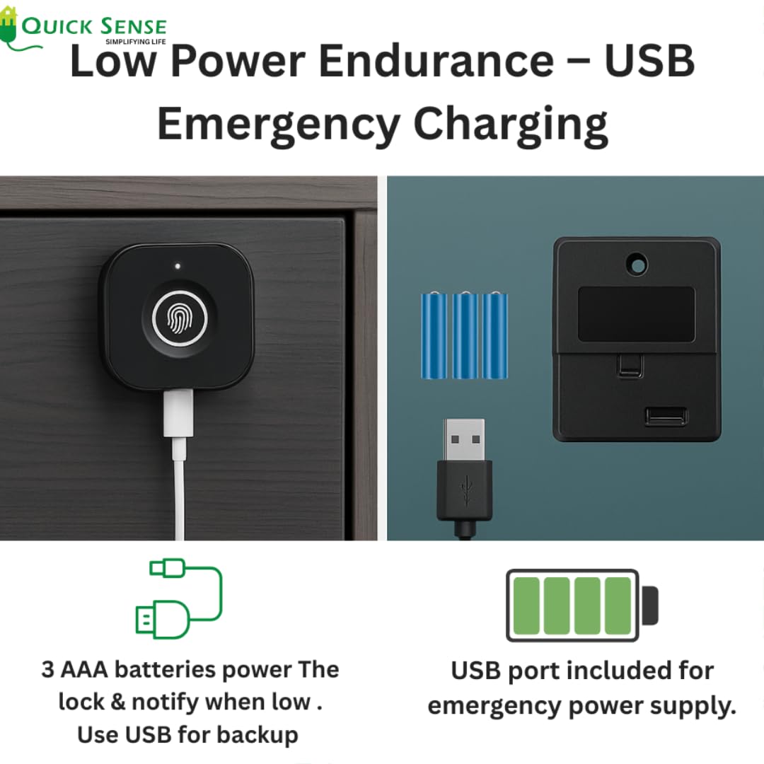 🔋 Emergency USB Key & Power Display: Runs on 3 AAA batteries (not included). Includes USB key port for emergency power backup. Power status is viewable in the app to avoid unexpected lockouts.