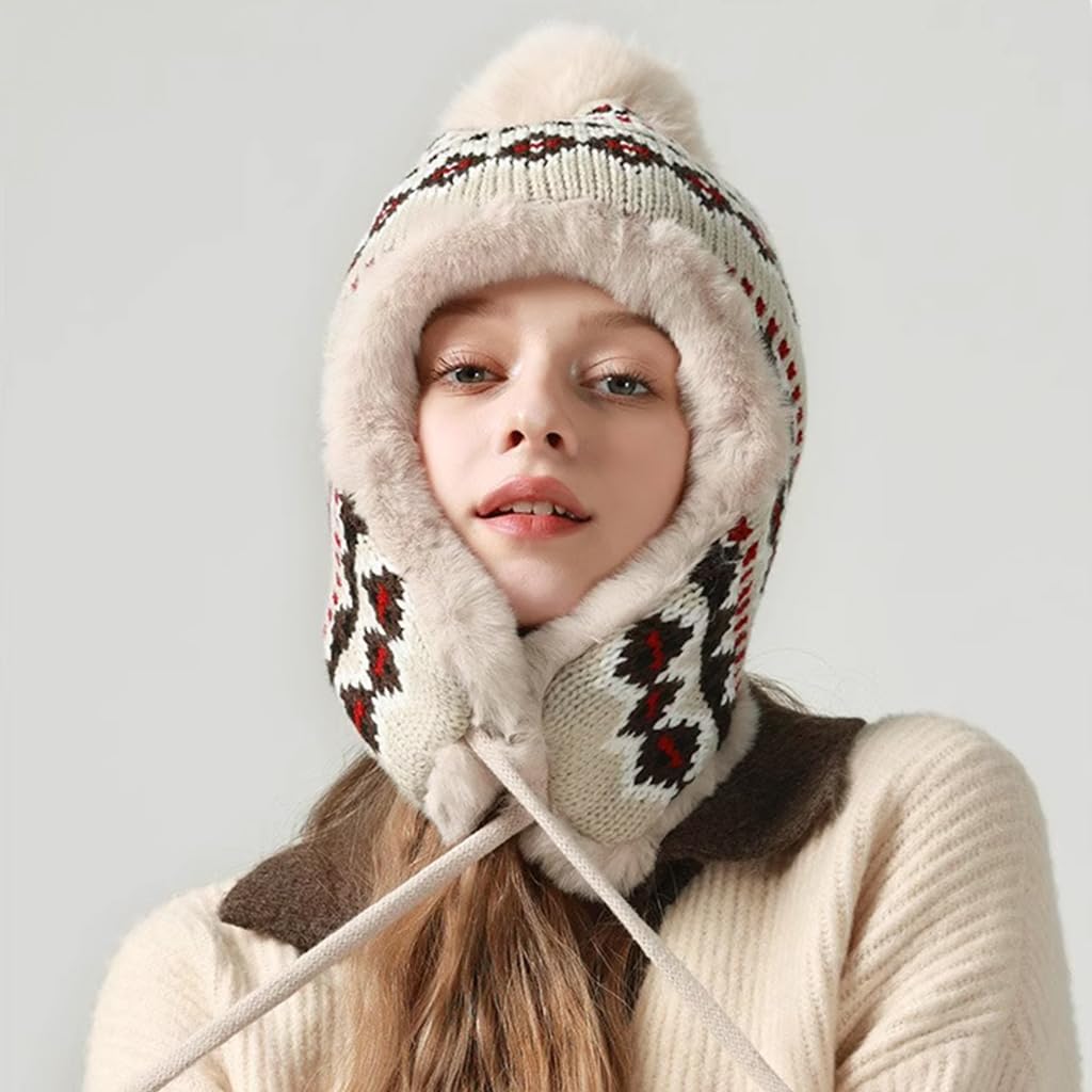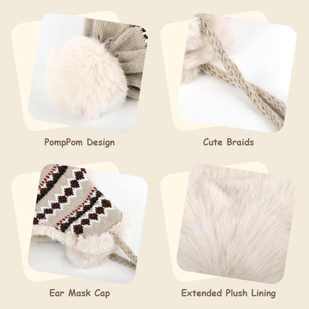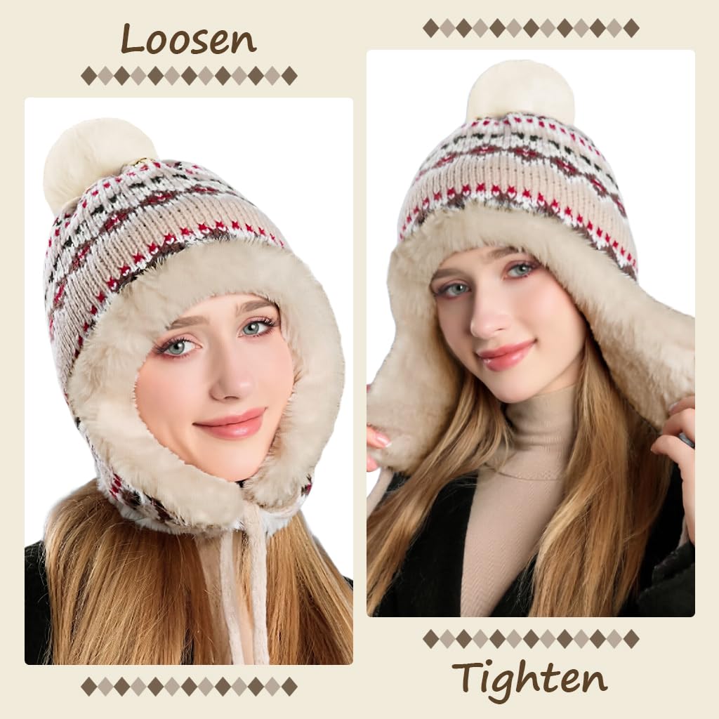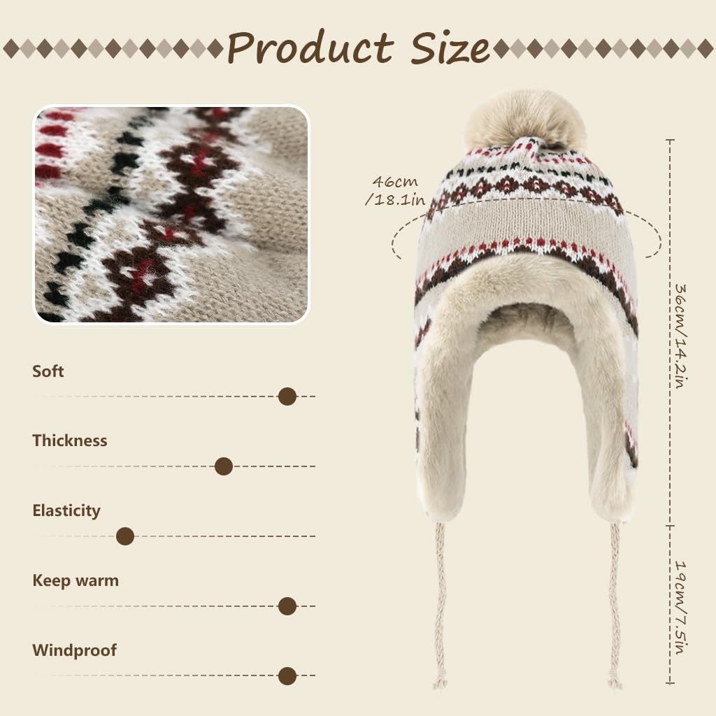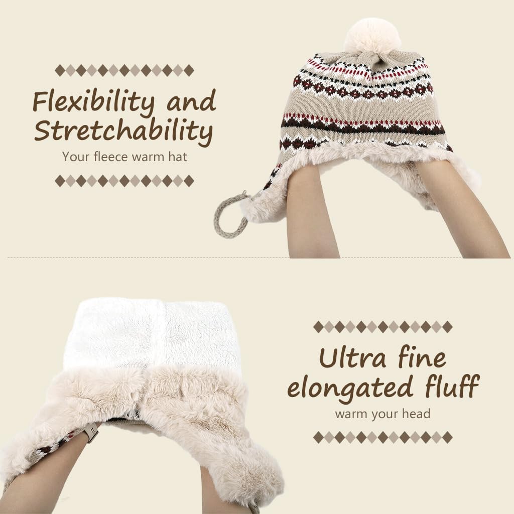 SANNIDHI® Winter Hat for Women Girls, Winter Ushanka Hat Warm Knitted Hat with with Ear Flaps, Plush Lined Design, Stylish Patterned Knit Ushanka Cap for Outdoor Activities, Christmas Gift Beige