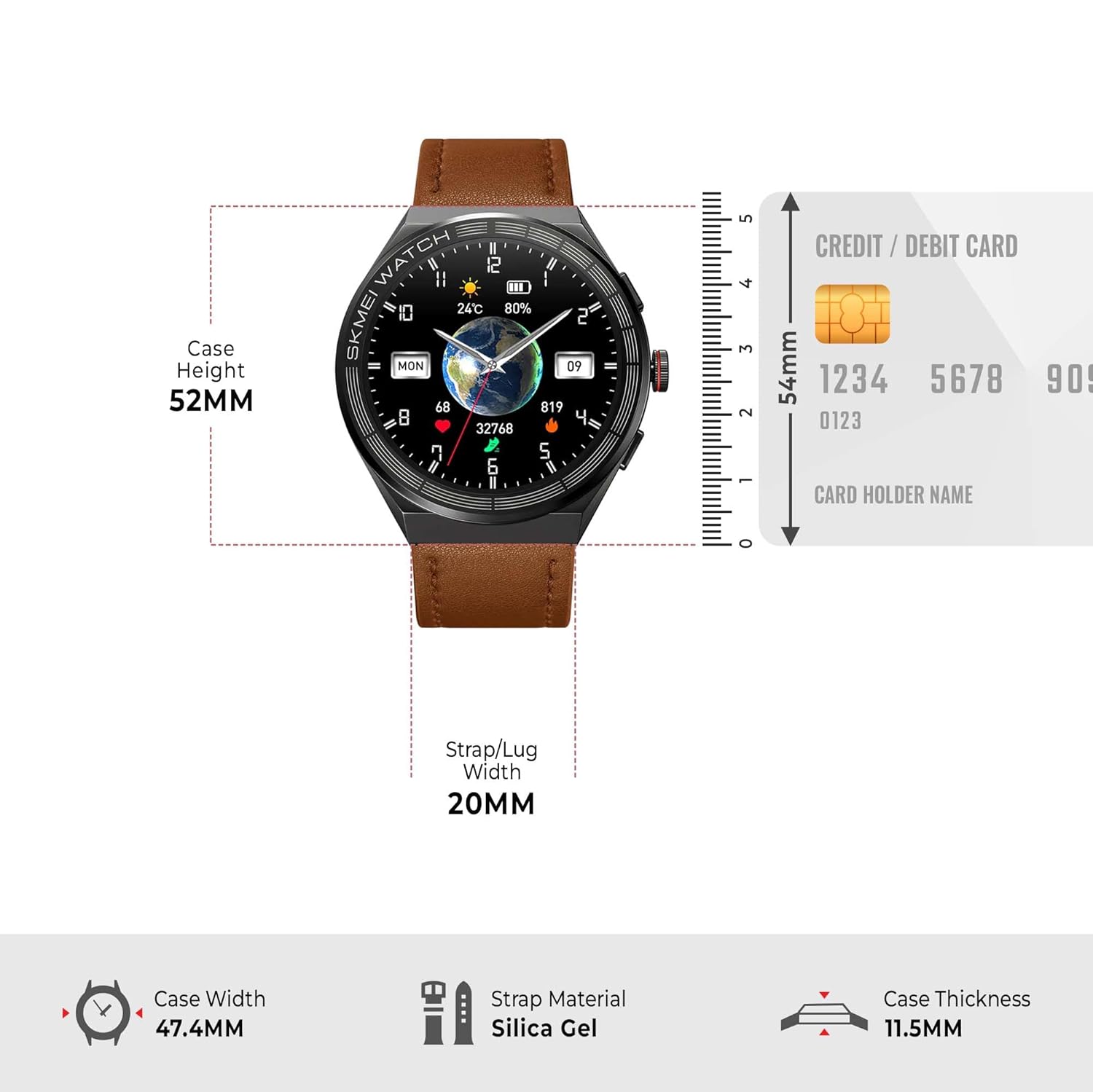 SKMEI Smartwatch Bluetooth Call for Android & iOS for Men's Fitness Tracker with Heart Rate, Blood Pressure & Sleep Monitor, IP68 Waterproof, Long Battery Life - S232 (Brown Leather Band)