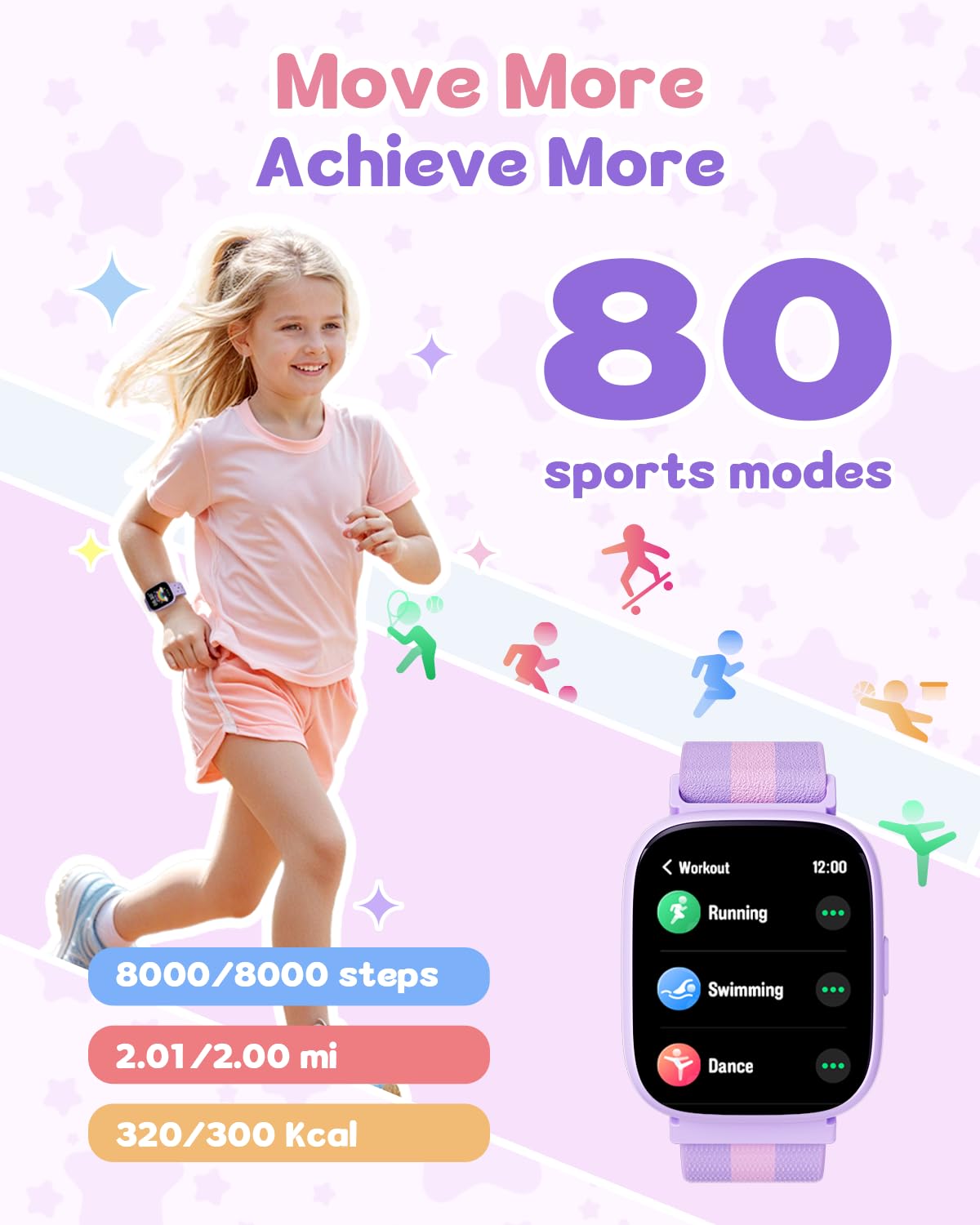 [All-Day Activity Tracking]: The TICTIKY Stellar 2 Smart Watch for kids and teens automatically tracks steps, distance, calories burned, and active minutes. With support for 80+ sports modes-including walking, running, cycling, swimming (IP68 waterproof), and basketball-it’s the perfect companion for active kids.