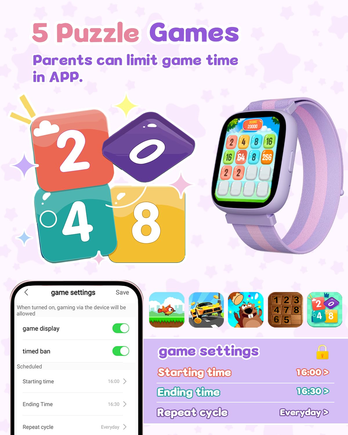 [Puzzle Games & Parental Controls]: Equipped with 5 built-in puzzle games to boost reaction and calculation skills, this smartwatch also includes parental controls. Use the app to restrict game access during school hours or lock games entirely, ensuring a balanced experience.
