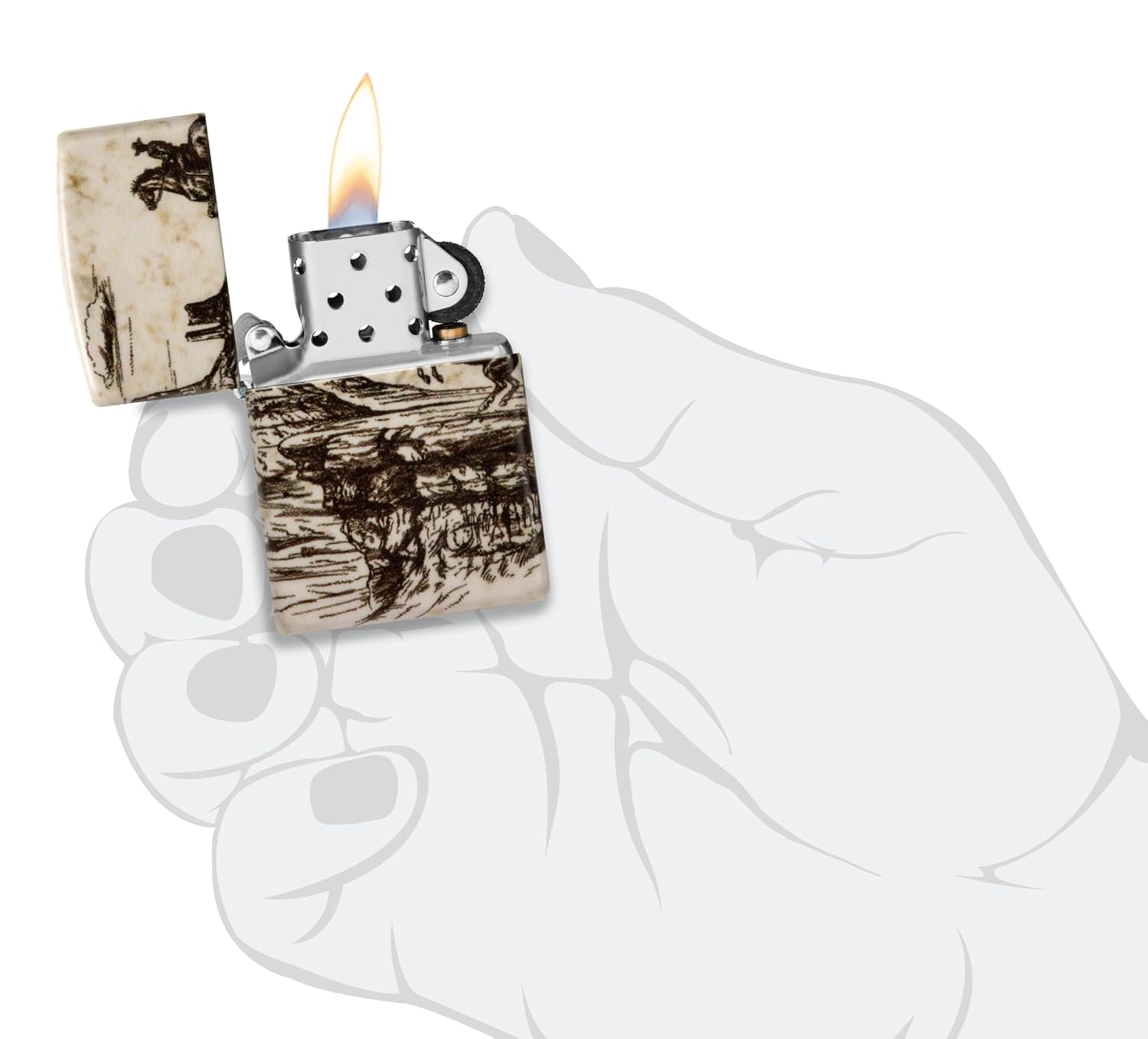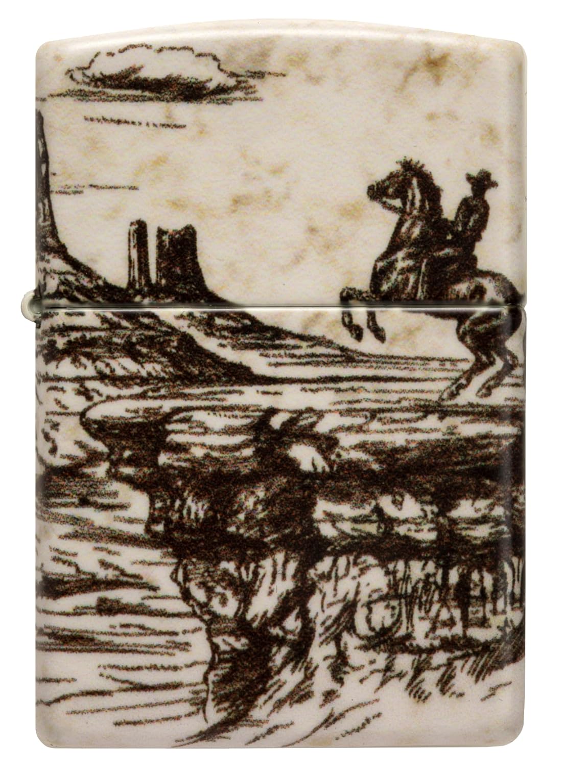 A lone rancher surveys the rugged frontier on this 540 Color lighter, which features the intricate monochromatic landscape sprawling across all sides.